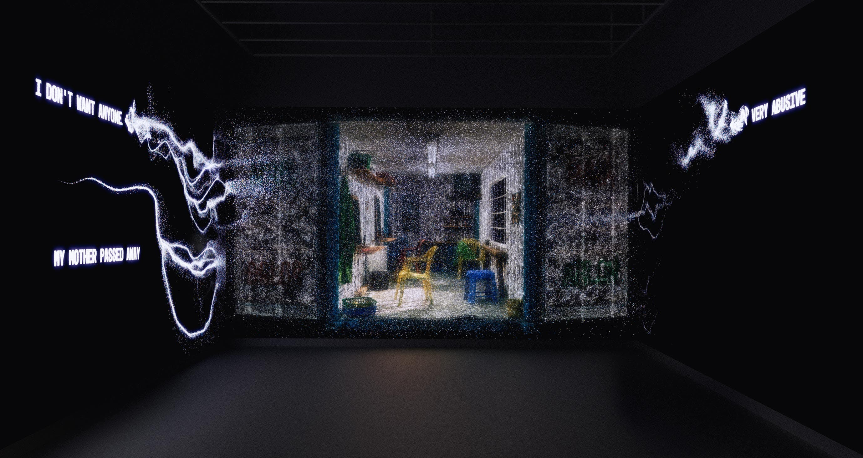 Inside the room we hear girls' voices – outtakes from research interviews where they talk about their experiences, hopes and dreams. Their words also appear as text on the walls, gradually dissolving as they have been spoken. The fragments from the words then travel across the room in the form of the most common migrant routes in the world today. Eventually the word-fragments reach the center wall where they assume the shape of an improvised hair salon, inside a freight container.